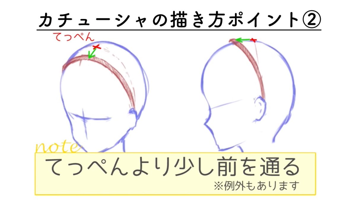 🌷カチューシャの描き方🌷未分類2023.02.24 お絵かき講座パルミー🌷カチューシャの描き方🌷 ・耳の後ろで固定される ・頭のてっぺんより少し前を通る この2点はどのカチューシャにも共通しているので、意識して描きましょう✨ https://t.co/3i0ARxynqw https://t.co/wExVGdve6H 引用元