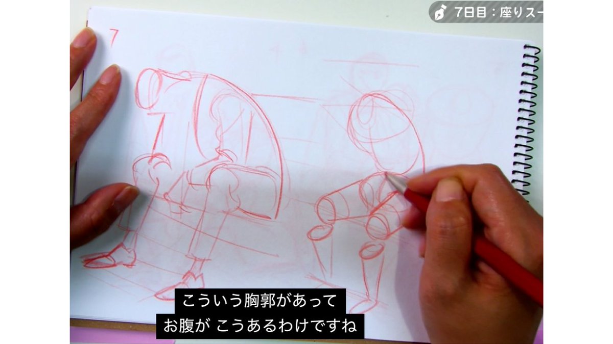 難しい座りポーズは、骨盤を描く▶︎円柱を描くという順番で描いていきます❗️骨盤の位置と床の設置面が合ってるか確認も大切です🧎‍♀️✨
