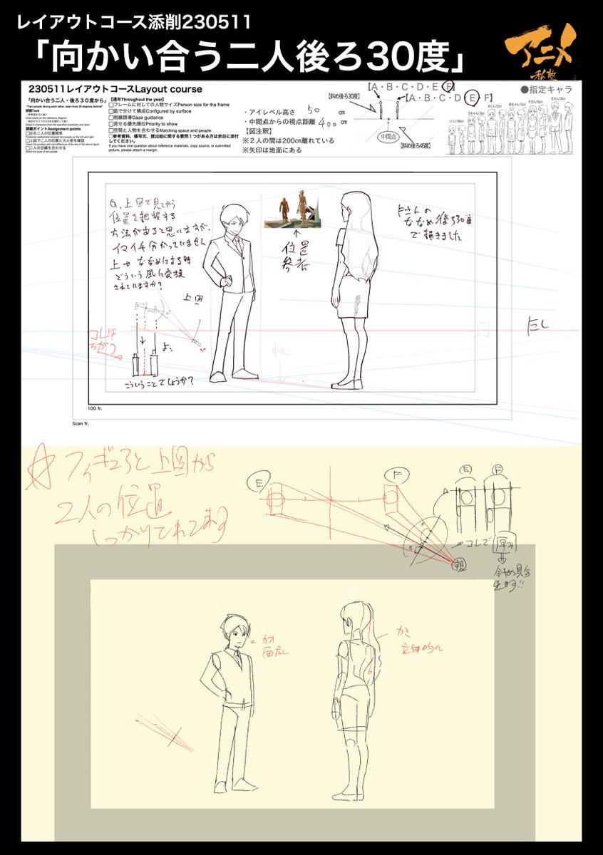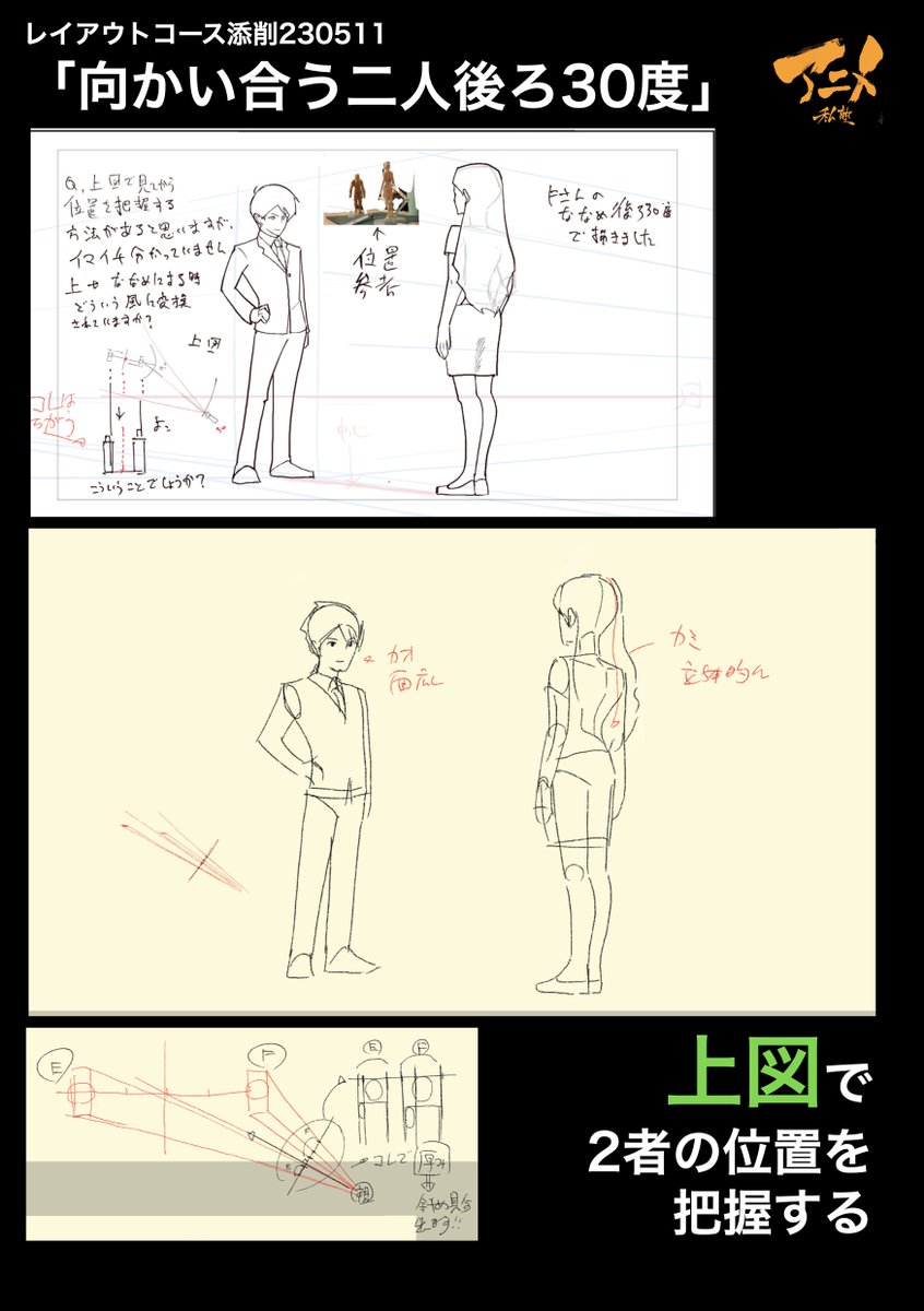 レイアウトコース添削「向かい合う二人後ろ…未分類2023.05.29 アニメ私塾レイアウトコース添削「向かい合う二人後ろ30度」 ●上図で二者の位置を把握する https://t.co/lXjoOQx95u 引用元
